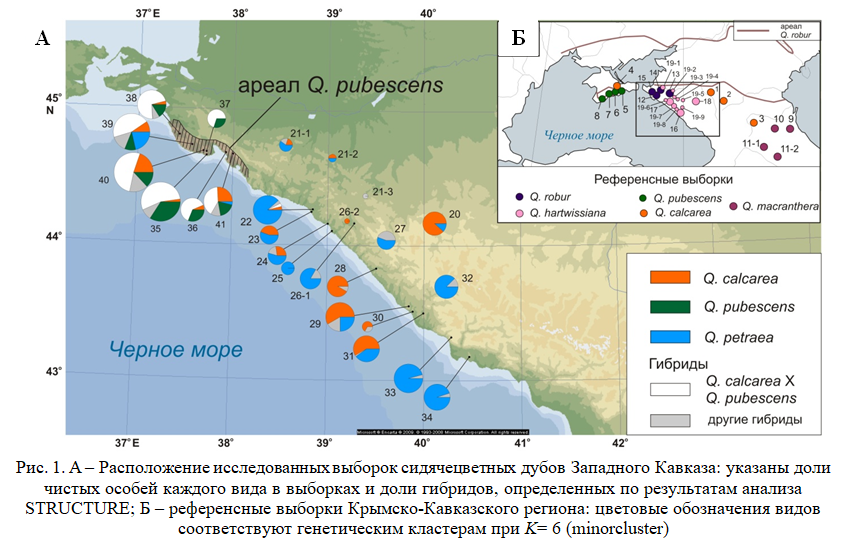 До настоящего времени систематика дубов Quercus на Западном Кавказе остается запутанной, что затрудняет инвентаризацию и пагубно отражается на лесохозяйственной деятельности. Впервые с помощью генетических маркеров исследованы особенности распространения и характер гибридизации произрастающих в регионе видов дубов (Рис. 1). Подтверждено произрастание и уточнены ареалы на западе Кавказа пяти видов. Показано наличие генетического потока между ними, установлена степень гибридизации и интрогрессии. Впервые описана гибридная зона в районе обитания дуба пушистого Q. pubescens, где преобладают его гибриды с дубом известняковым Q. calcarea. Вне ареала Q. pubescens количество гибридов резко снижалось. Между дубом известняковым и дубом скальным, несмотря на частое совместное произрастание, процент гибридов был небольшим. Показана зависимость состава видов и гибридов в популяциях от условий местообитания. Результаты исследования указывают на необходимость корректировки современных флор и определителей. Для лесной селекции перспективно использование генетических ресурсов всех описанных видов и их гибридов.