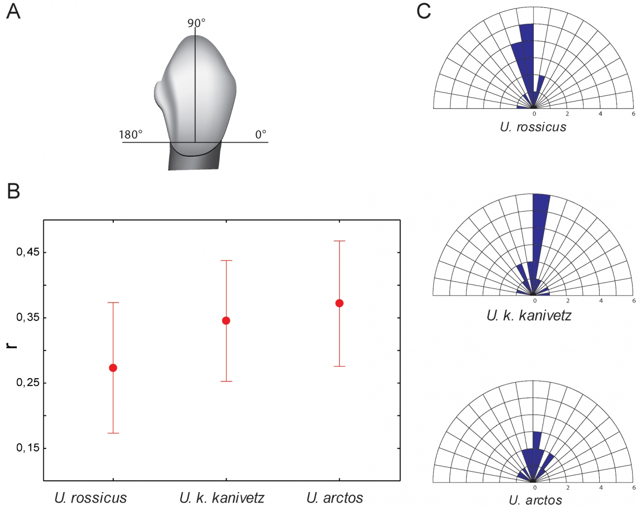Межвидовые различия в ориентации микроизноса относительно вертикальной оси зуба. (A) Схема угловых секторов на неокклюзионной поверхности резца относительно горизонтальной и вертикальной осей; (B) Межвидовые различия в средней длине вектора (r); (C) Концентрические диаграммы, показывающие средние углы ориентации на образец (сектор = угол, радиус = количество образцов).