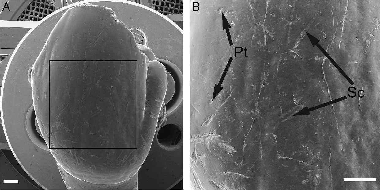 Общий вид и расположение аналитической зоны (А) на лабиальной поверхности резца. Ямки (Pt) и царапины (Sc) в пределах аналитической зоны (Б). Масштабная линейка: 1 мм.