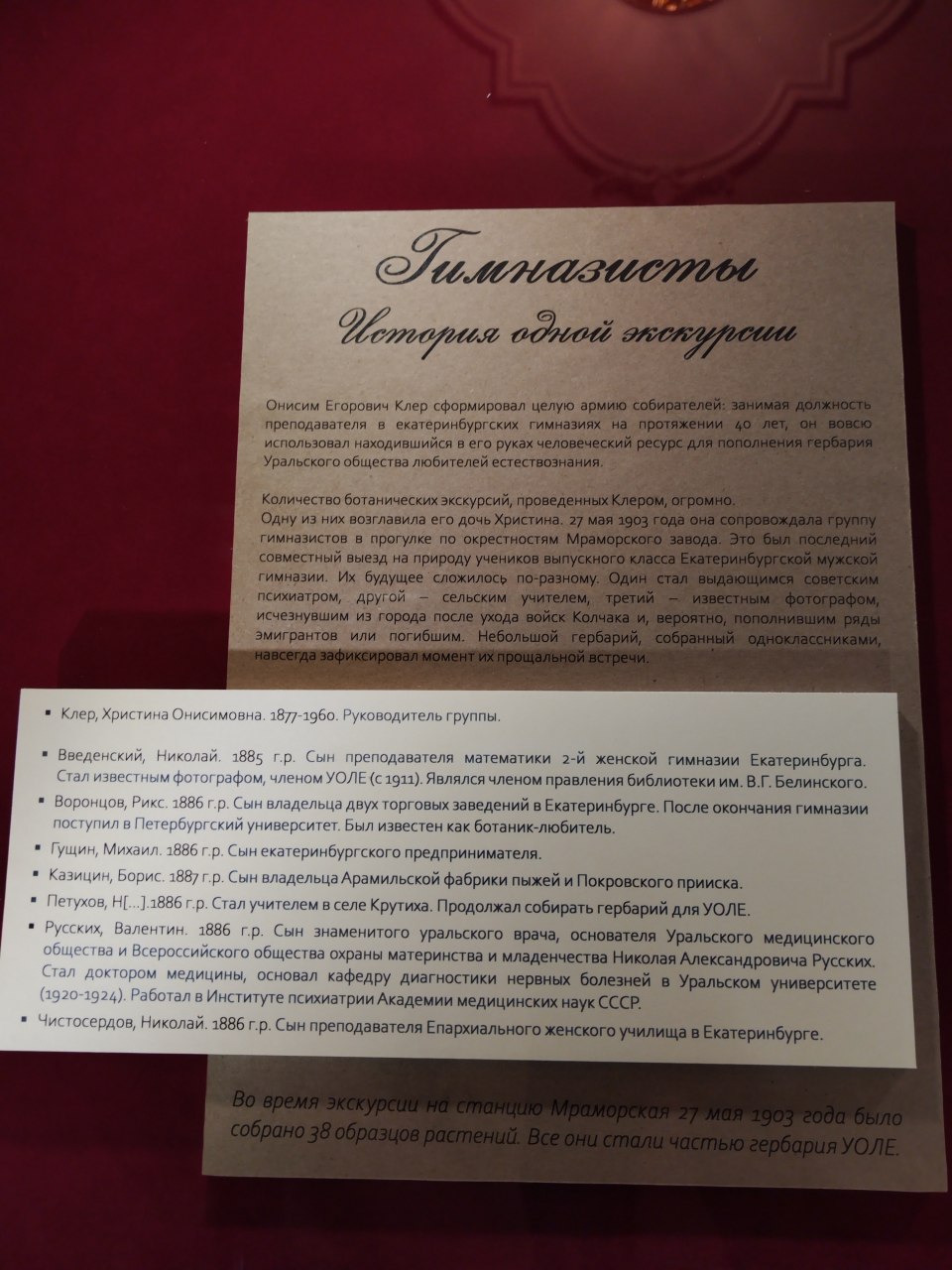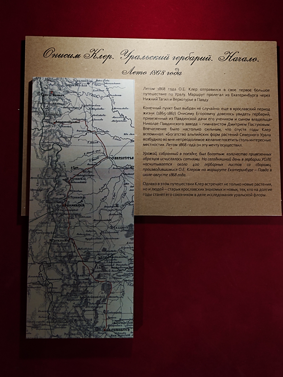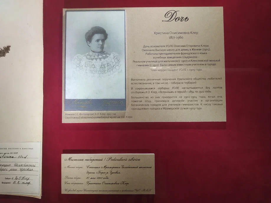 В резиденции губернатора Свердловской области открылась выставка «Старый гербарий». Это часть гербарной коллекции из хранилищ Института экологии растений и животных УрО РАН, имеющая более чем столетнюю историю. Некоторые экземпляры датируются XIX веком, когда в Екатеринбурге только-только начинало свою деятельность Уральское общество любителей естествознания (УОЛЕ). Каждый гербарный лист в экспозиции снабжен не только этикеткой, на которой указана дата и место сбора, но и информацией о том, кто внес этот экземпляр в коллекцию. В экспозиции есть растения, собранные руками основателя УОЛЕ, Онисима Егоровича Клера, а также руками его близких. Но в сборе гербария участвовали и гимназисты, археологи, ссыльные, врачи, чиновники, крестьяне – эти очень разные люди стояли у истоков биологической науки на Урале.