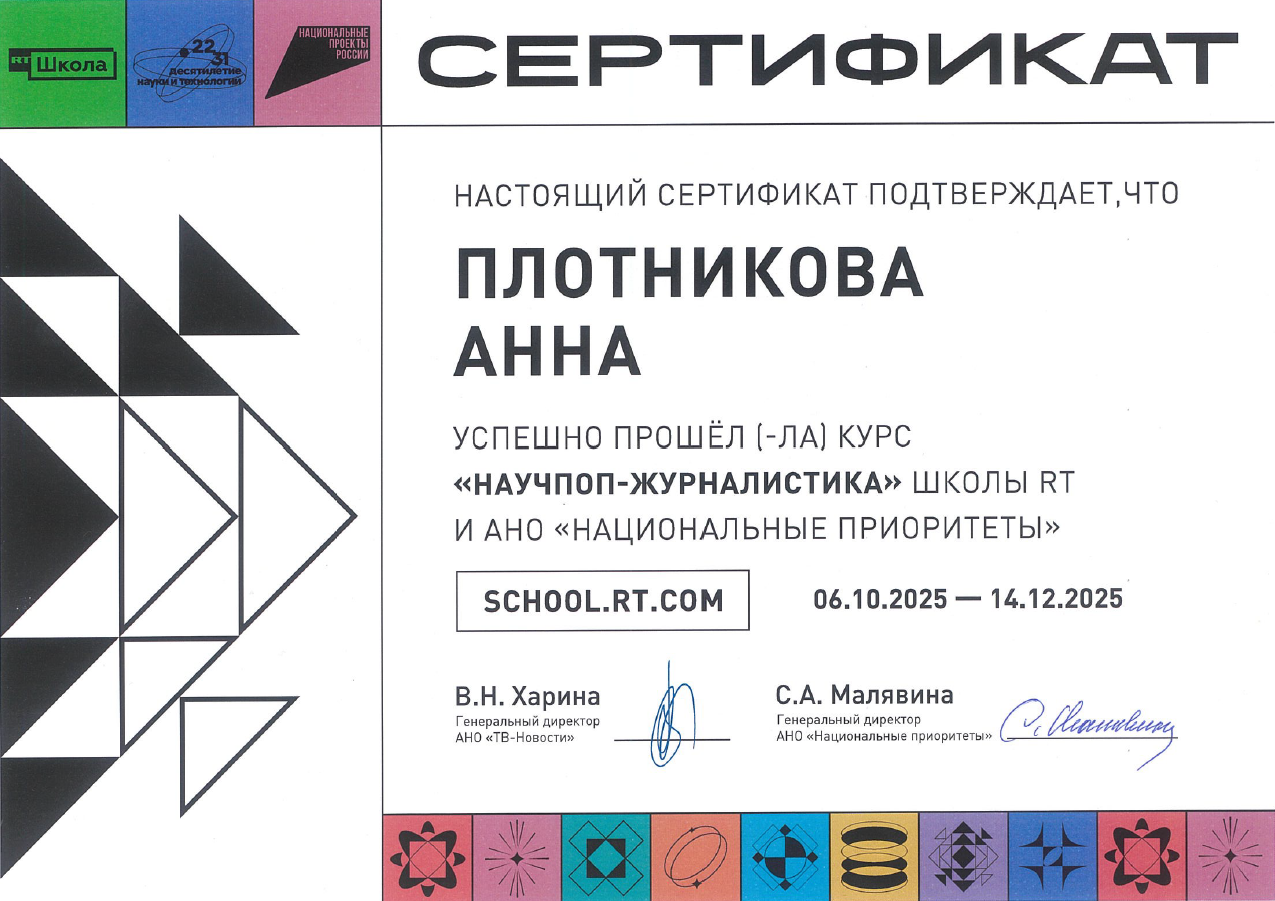 Специалист по связям с общественностью ИЭРиЖ УрО РАН Анна Плотникова повысила свою квалификацию – прошла онлайн-курс «Научпоп-журналистика» школы RT и АНО «Национальные приоритеты». Курс состоял из лекций и вебинаров на различные темы, а также заданий, которые оценивались экспертами.