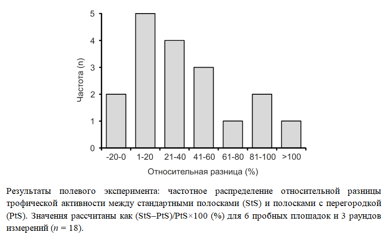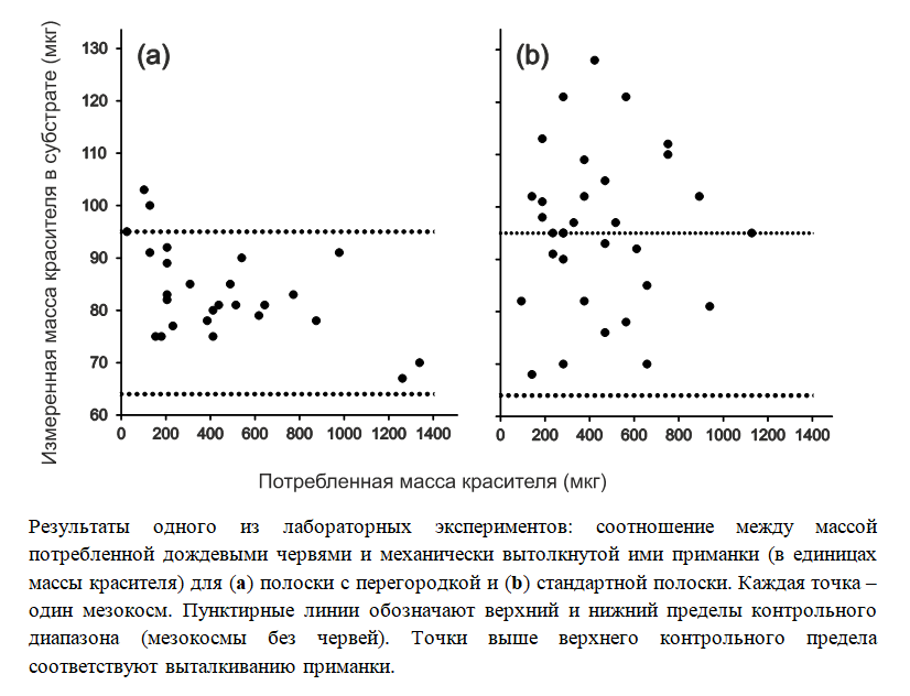 В лабораторных экспериментах с использованием красителя и в полевых наблюдениях удалось доказать: в отличие от более мелких беспозвоночных – ногохвосток, клещей и энхитреид, дождевые черви не просто съедают приманку, а, проползая сквозь отверстия полосок, механически выдавливают ее наружу. Такие «дурные манеры» дождевых червей приводят к тому, что результат теста оказывается завышен в среднем на треть, а в отдельных случаях – даже вдвое. Это делает некорректным сравнение участков с разной численностью дождевых червей.